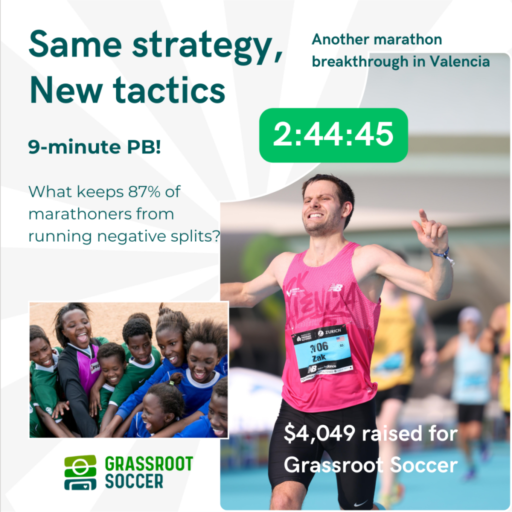 A study looking at 876k marathon results found that only 13% of marathoners run a negative split but 52% of multi-marathon runners ran their best time when negative splitting!