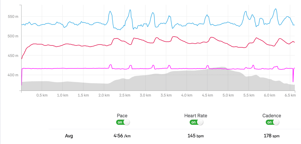 The readings from the arm-based monitor are more immediately responsive to changes in terrain and pace. When I’m using my arm-based Polar HRM, my heart rate will start to climb immediately as soon as I start climbing a hill, it levels off when and it will start dropping as soon as I start descending a hill, whereas my wrist HR tends to lag – my heart rate goes up, but only after 30 seconds of climbing and then it stays elevated after I’ve crested the hill. Similarly, when I do strides or intervals the arm-based monitor shows my HR rising and falling as my pace changes, whereas the wrist HRM usually just shows my HR as elevated the whole time while doing strides (even when recovering). Here are readings from three recent easy runs (two with the arm HRM and one with the wrist HRM).