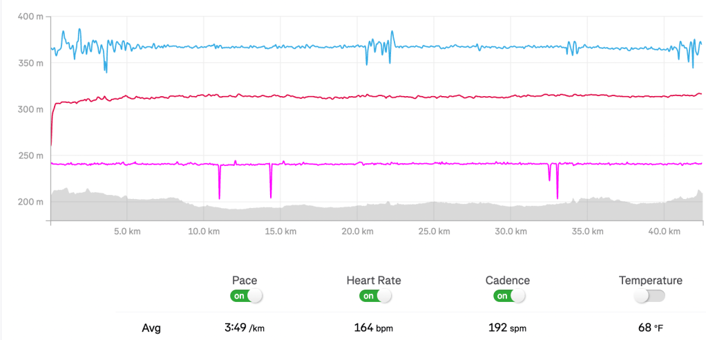 The race winds through 29 neighborhoods in Chicago, each bringing out a different energy and vibe to support the runners. With the exception of a few quite miles late in the race, the environment is electric, with live blues, blaring bachata, and thousands of screaming supporters. Another notable aspect of the Chicago Marathon (compared to marathons I’ve run in Europe) is the insane number of aid stations – 20 (!) to be exact, each offering water and Gatorade. Maurten gels (CAF100 and M100) were offered at three points on the course, which was a big plus. The huge number of sponsors and amount of swag between the expo and the finish line bordered on laughable – bars, beer, bananas, protein drinks, and so on. I could hardly carry all the stuff they gave out after the race. Lots of influencers run this race, and I enjoyed getting to chat with Eric Floberg before and after (he’s a Chicago native and has great content, including helpful Chicago Marathon tips and walkthroughs). One of thing to note about the Chicago Marathon is that, due to high buildings and some covered sections, GPS signals are notoriously unreliable for the first 5k and again in the middle and end of the race (note the wild wobbles on my pace chart). Lots of runners opt to manually split miles on their watch, but because I’m used to km splits I opted to let my watch do its thing and found that it pretty much evened itself out by 5k.