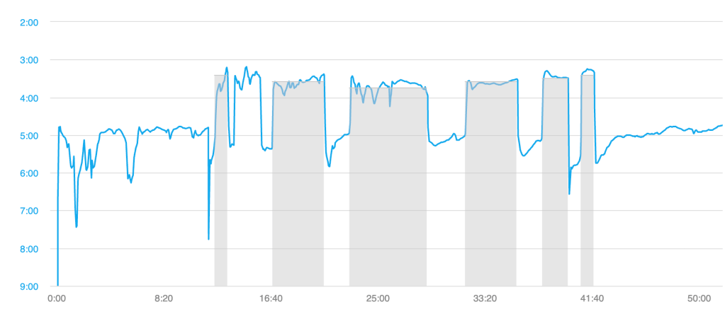 – 1 min @ 5k pace (followed by 10-15 min cool down jog) –> 3:20-3:25