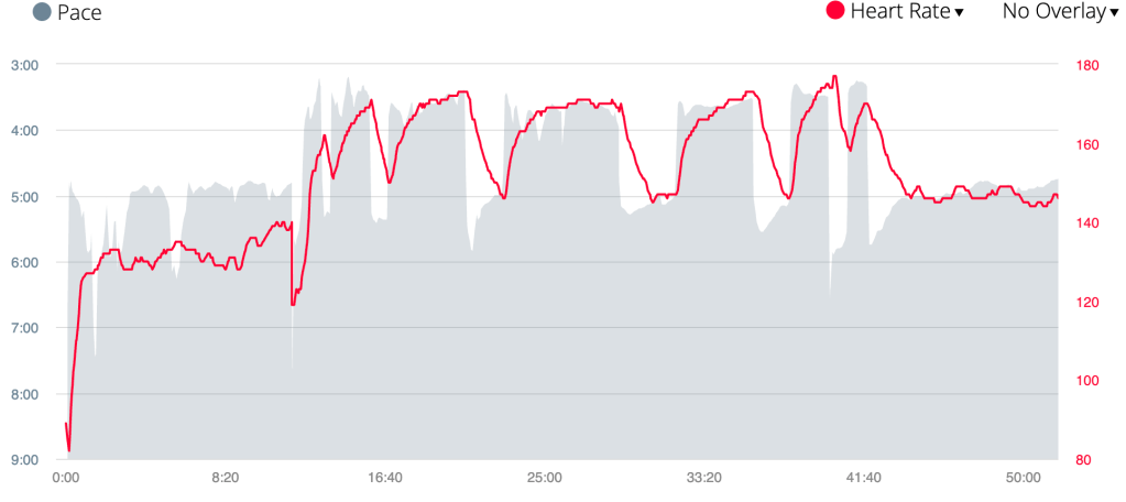 Typically, my HR won’t fully recover to resting during the 30-second or 1-minute recovery jogs, but then it comes back down to the top of Zone 2 during the 2-minute and 3-minute recovery jogs.